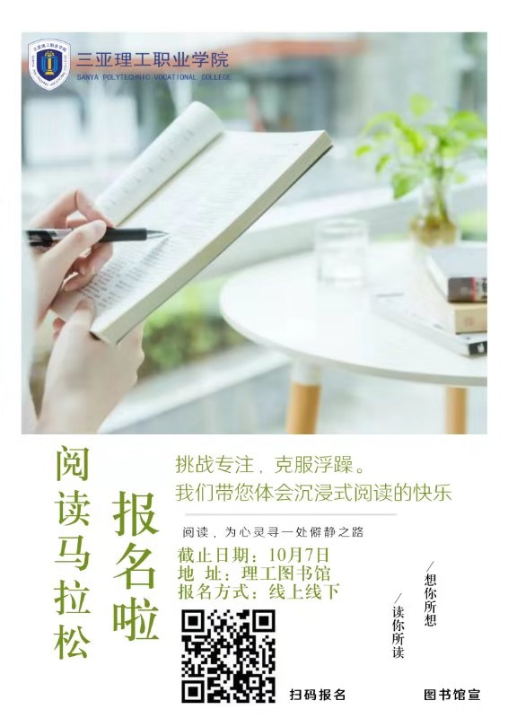 2019/9/26“讀萬卷書,行萬里路”閱讀和行走都是充實自己的途徑!伴喿x馬拉松”賦予讀書別樣的儀式感,讓閱讀成為我們的一種生活方式!按┰叫@,邂逅文脈”2019年10月8日三亞理工學院圖書館將舉行第五屆閱讀馬拉松月挑戰(zhàn)賽,將帶來一場沉浸式的校園閱讀體驗;顒...