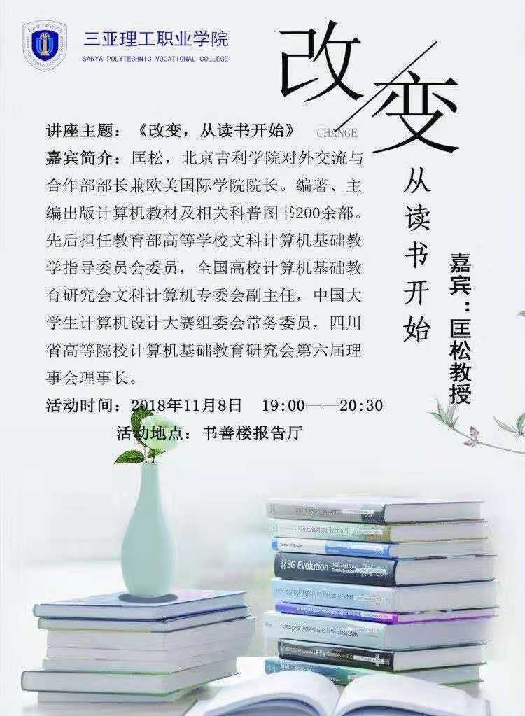 各部門、系(部):為做好校風(fēng)建設(shè),營(yíng)造良好的讀書氛圍,圖書館特邀請(qǐng)北京吉利學(xué)院對(duì)外交流與合作部部長(zhǎng)兼歐美國(guó)際學(xué)院院長(zhǎng)匡松教授來我院講座。請(qǐng)各部門、系(部)組織教師、學(xué)生參加。時(shí)間:2018年11月8日(周四)19:00—20:30地點(diǎn):書善樓報(bào)告...