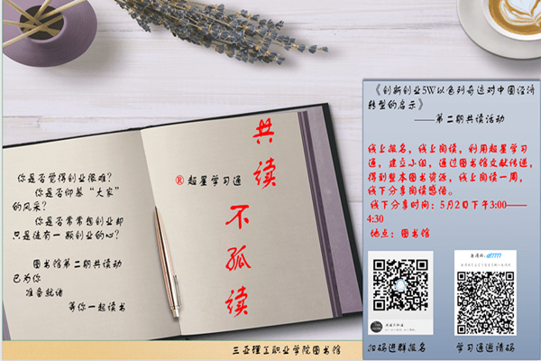 新一期共讀一本的書目信息已經(jīng)上傳至學(xué)習(xí)小組,線上報(bào)名,線上閱讀,利用超星學(xué)習(xí)通,建立小組,通過文獻(xiàn)傳遞,得到整本圖書資源,線上閱讀,線下分享閱讀感悟。線下分享時(shí)間:5月2日下午3:00——4:30地點(diǎn):圖書館報(bào)名途徑:掃下圖二維碼入QQ群,手機(jī)下...