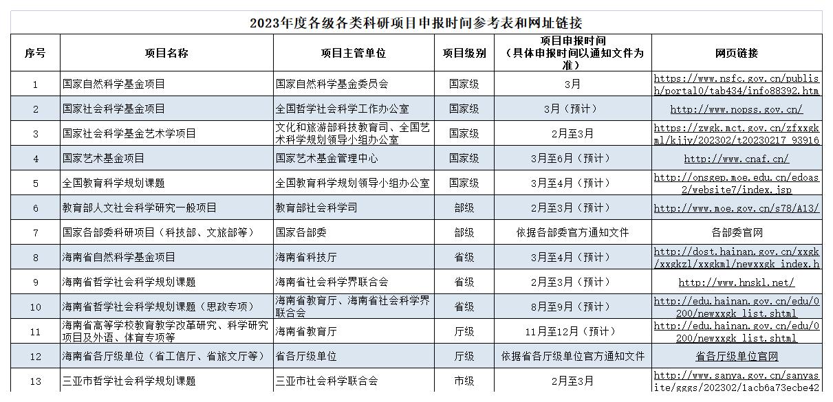 2023年度各級(jí)各類科研項(xiàng)目申報(bào)時(shí)間參考表和網(wǎng)址鏈接