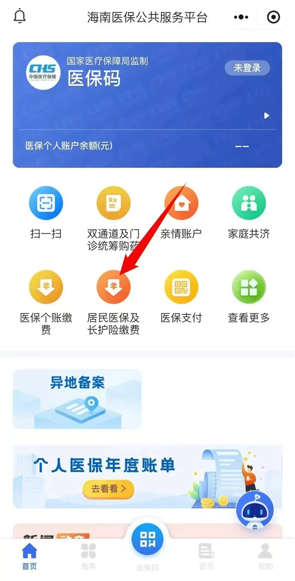 點(diǎn)擊海南醫(yī)保微信公眾號(hào),選擇“醫(yī)保大廳”—點(diǎn)擊“醫(yī)保小程序”,選擇“居民醫(yī)保及長(zhǎng)護(hù)險(xiǎn)繳費(fèi)”業(yè)務(wù)。