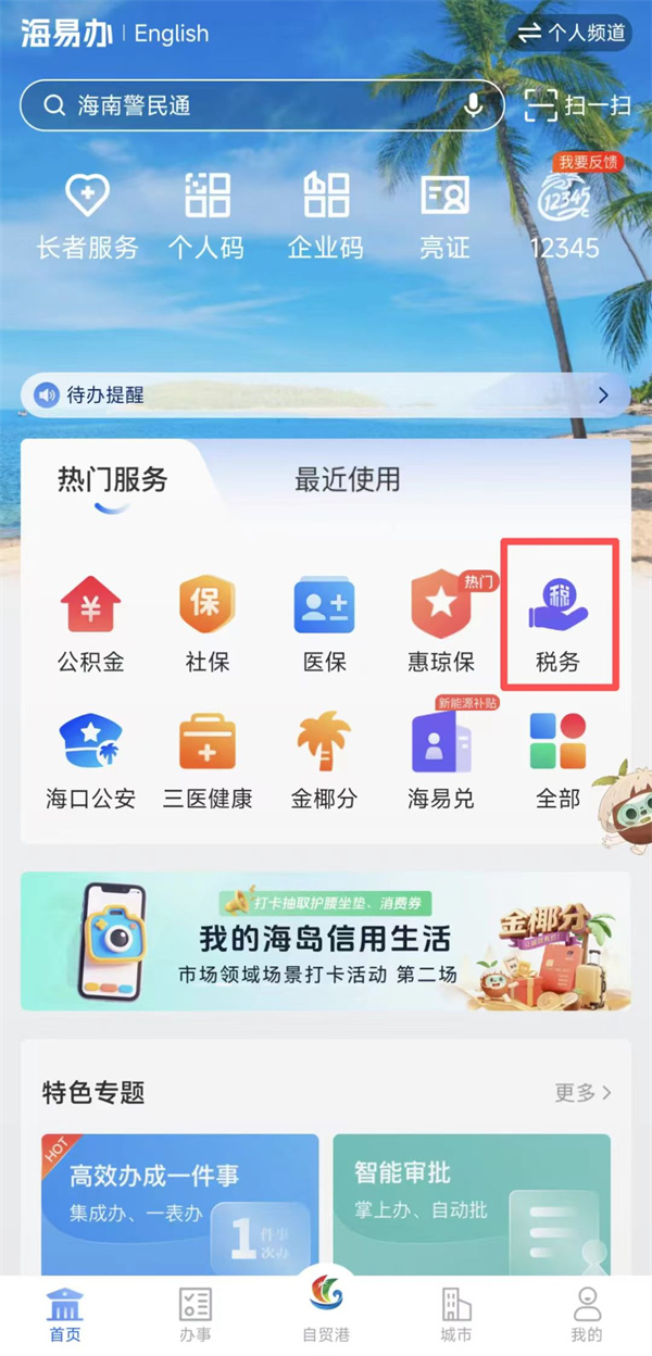 進(jìn)入海易辦首頁,點(diǎn)擊“稅務(wù)”——“城鄉(xiāng)居民醫(yī)療”進(jìn)入繳費(fèi)頁面。