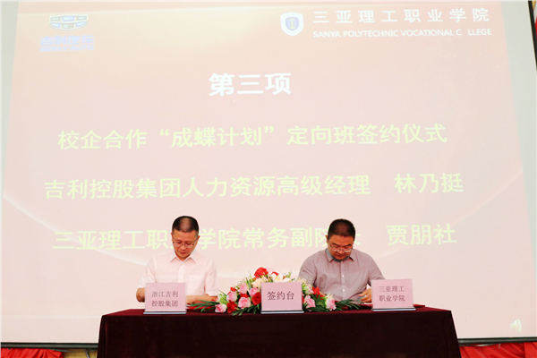2017/9/89月8日,三亞理工職業(yè)學(xué)院與浙江吉利汽車有限公司簽訂“成蝶計(jì)劃”定向班協(xié)議書,深度開展“現(xiàn)代學(xué)徒制”校企合作模式,計(jì)劃在5年內(nèi)定向培養(yǎng)1000名以上汽車領(lǐng)域人才。雙方達(dá)成的“成蝶計(jì)劃”定向班采取簽訂培養(yǎng)協(xié)議,定向?qū)I(yè)、定向招生、定向就業(yè)“一簽三定...