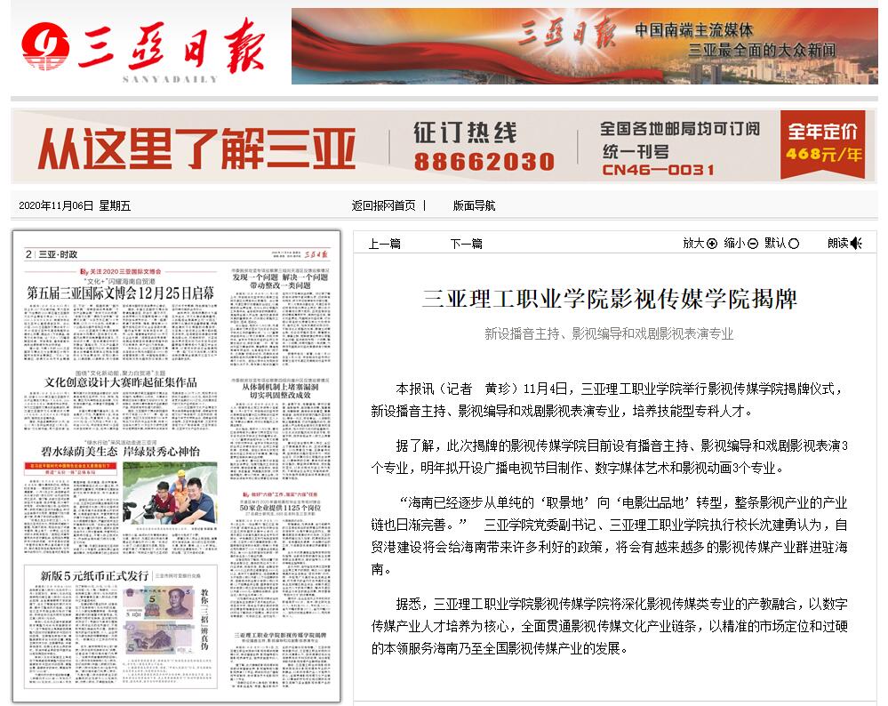 【三亞日?qǐng)?bào)】三亞理工職業(yè)學(xué)院數(shù)字媒體學(xué)院揭牌 新設(shè)播音主持、影視編導(dǎo)和戲劇影視表演專業(yè)
