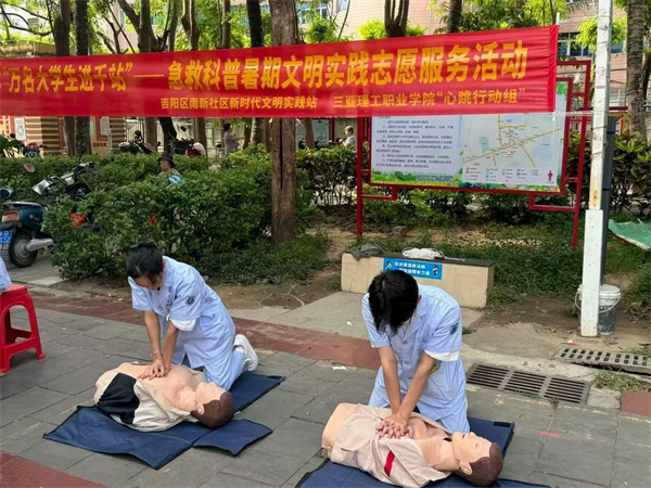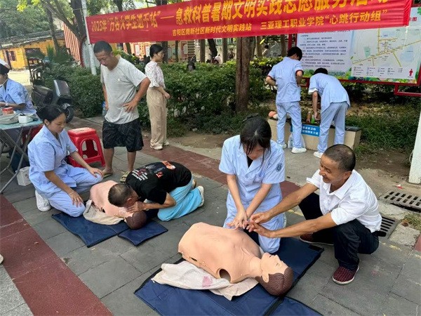 近日,三亞理工職業(yè)學(xué)院旅游與康體產(chǎn)業(yè)學(xué)院“心跳行動組”的同學(xué)們在兩位指導(dǎo)老師的帶領(lǐng)下走進(jìn)三亞市南新大社區(qū)。小組成員針對心肺復(fù)蘇(CPR)、海姆立克急救法等實用技能,深入社區(qū)手把手教學(xué),讓更多人學(xué)會“救命本事”。