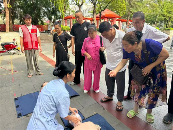 現(xiàn)場氣氛熱烈,志愿者們一邊在人體模型上示范,周圍居民駐足學(xué)習(xí)急救知識,不少居民還主動參與,健康的種子此刻在悄悄發(fā)芽。