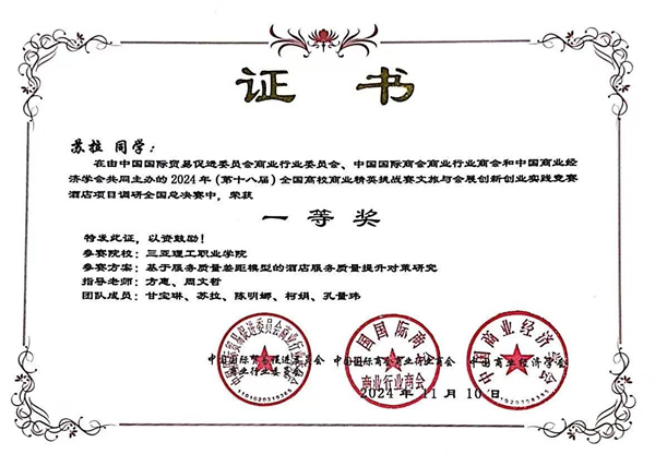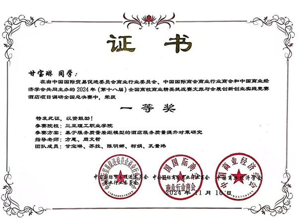 在學(xué)生組全國(guó)總決賽中,學(xué)校代表隊(duì)捷報(bào)頻傳,榮獲一等獎(jiǎng)、二等獎(jiǎng)和三等獎(jiǎng)各一項(xiàng)。在酒店項(xiàng)目調(diào)研賽道,通過(guò)深入調(diào)研和分析,參賽學(xué)生充分展示了他們對(duì)酒店行業(yè)的深刻理解和創(chuàng)新思維,贏得了評(píng)委的高度贊譽(yù)。