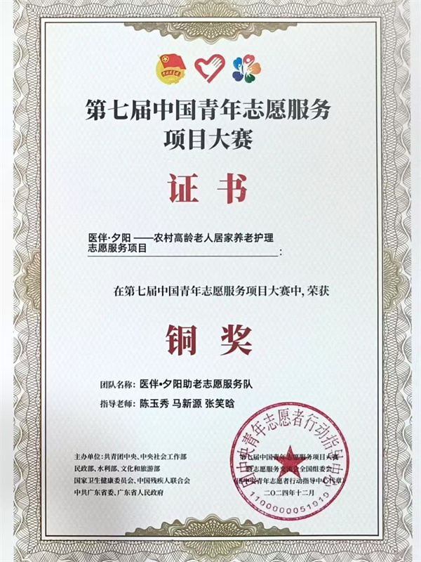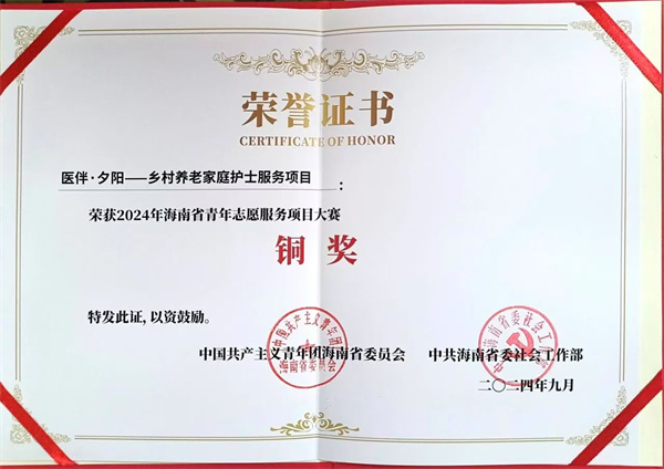 自2024年3月大賽啟動以來,“醫(yī)伴·夕陽”助老志愿服務(wù)團隊在指導(dǎo)老師的精心指導(dǎo)下開展志愿服務(wù),認真打磨,反復(fù)優(yōu)化,經(jīng)過激烈角逐,在全省129個項目中突圍成功,入圍省賽,已于2024年9月榮獲2024年海南省青年志愿服務(wù)項目大賽銅獎。同期項目獲得國賽入圍資格,最終在全國入圍的萬余個項目中斬獲銅獎,這是對參賽團隊項目成果建設(shè)的又一次肯定和鼓勵。