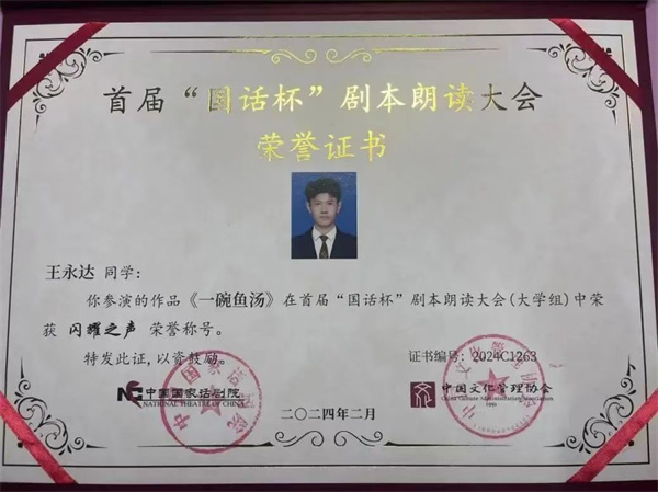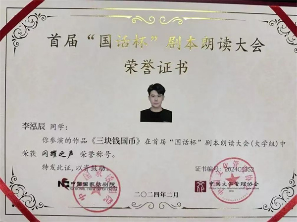 在第一屆“國話杯”劇本朗讀大賽中,理工學(xué)子同樣也取得了非常優(yōu)異的成績,數(shù)字媒體學(xué)院表演221班學(xué)生董睿祺、表演231班學(xué)生李泓辰和陶恒智,憑借作品《三塊錢國幣》展現(xiàn)出精湛的演技和對劇本深刻的理解;播音231班學(xué)生魏子旭、王永達帶來的《一碗魚湯》,以細膩的情感傳遞打動了在場的每一個人 。最終,五名學(xué)生榮獲了第一屆“國話杯”劇本朗讀大賽“閃耀之聲”獎。