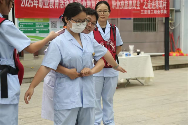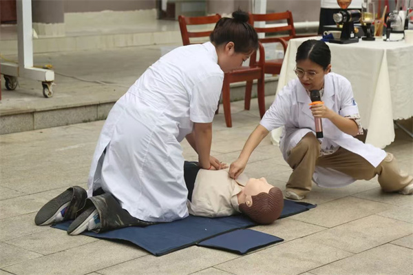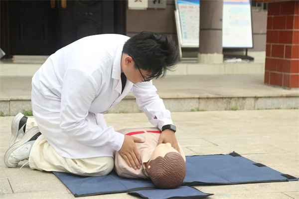 旅游與康體產(chǎn)業(yè)學(xué)院的急救技能展示區(qū)圍滿了認(rèn)真學(xué)習(xí)的居民。師生們通過模擬教具演示心肺復(fù)蘇(CPR)、海姆立克急救法等實(shí)用技能,詳細(xì)講解操作要點(diǎn)和黃金救援時(shí)間!鞍磯侯l率要保持每分鐘 100-120 次”“打開氣道時(shí)需使下頜角與耳垂連線垂直地面”…… 在師生指導(dǎo)下,多位居民上臺(tái)實(shí)操練習(xí),現(xiàn)場(chǎng)形成“人人學(xué)急救、急救為人人” 的濃厚氛圍。