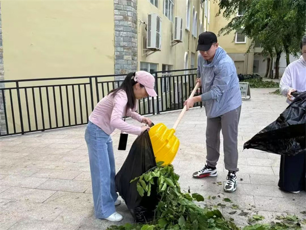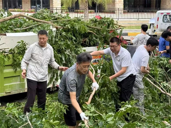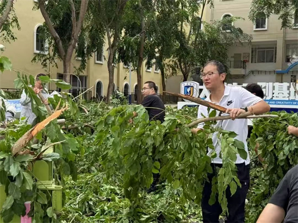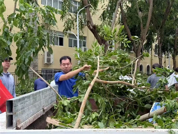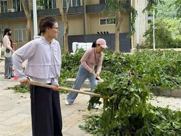 清晨 8:30,學(xué)校魯班廣場上黨旗獵獵,黨員干部們身著防曬服、手持勞動(dòng)工具整齊列隊(duì)。校領(lǐng)導(dǎo)率先扛起粗大樹枝,并帶領(lǐng)隊(duì)伍分赴書善樓周邊、R1-R7 宿舍區(qū)開展清理。現(xiàn)場呈現(xiàn)出一幕幕動(dòng)人場景: