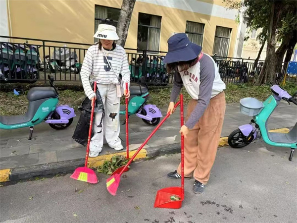 在魯班廣場旁,臺風(fēng)刮落的樹干枯枝堆積成兩米高的 "小山",黨員干部們徒手搬運(yùn)、接力傳遞,將直徑近 20 厘米的樹干逐一裝載上垃圾轉(zhuǎn)運(yùn)車,手掌磨出紅印卻無人喊停;主干道上,落葉與淤泥混合成 "攔路虎",黨員們手持鐵鍬、掃帚分組作業(yè),有人負(fù)責(zé)鏟除結(jié)塊淤泥,有人用力將枯枝落葉分裝入袋,汗水順著臉頰滴入積水,卻讓暢通的道路逐漸顯露本色;汗水濕透了衣衫,卻沒有一人停下手中的工作,大家相互協(xié)作,配合默契,黨員教師們蹲下身,耐心清理垃圾,用實(shí)際行動(dòng)守護(hù)校園的每一抹綠色。