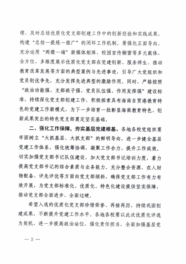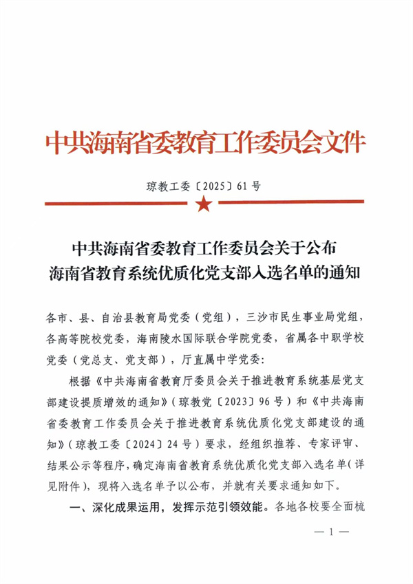 此次評選嚴格遵循《中共海南省委教育工作委員會關(guān)于推進教育系統(tǒng)優(yōu)質(zhì)化黨支部建設(shè)的通知》(瓊教工委〔2024〕24 號)要求,歷經(jīng)組織推薦、專家評審和結(jié)果公示等嚴謹程序。入選黨支部需全面達到 “政治功能強、支部班子強、黨員隊伍強、作用發(fā)揮強” 的建設(shè)標準,并在服務師生、推動教育改革創(chuàng)新等方面取得顯著成效,充分展現(xiàn)黨支部的凝聚力和戰(zhàn)斗力。
