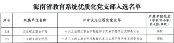 近日,中共海南省委教育工作委員會正式公布2025年海南省教育系統(tǒng)優(yōu)質(zhì)化黨支部評選結(jié)果,三亞理工職業(yè)學院智能汽車與工程學院學生黨支部和經(jīng)濟與貿(mào)易學院學生黨支部被認定為“海南省教育系統(tǒng)優(yōu)質(zhì)化黨支部”。