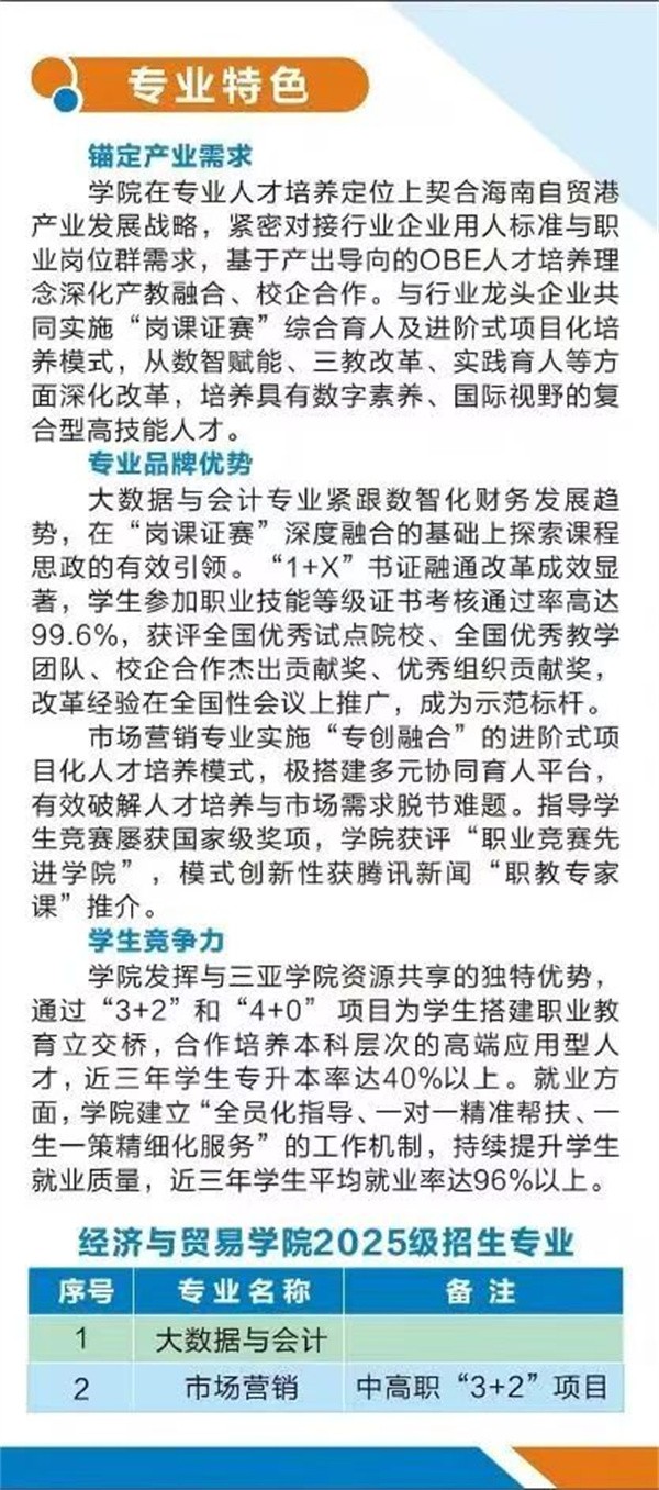 學(xué)院擁有良好的辦學(xué)基礎(chǔ)和優(yōu)秀的師資隊(duì)伍。2025年招生專業(yè)有大數(shù)據(jù)與會(huì)計(jì)和市場(chǎng)營(yíng)銷中高職“3+2”項(xiàng)目。
