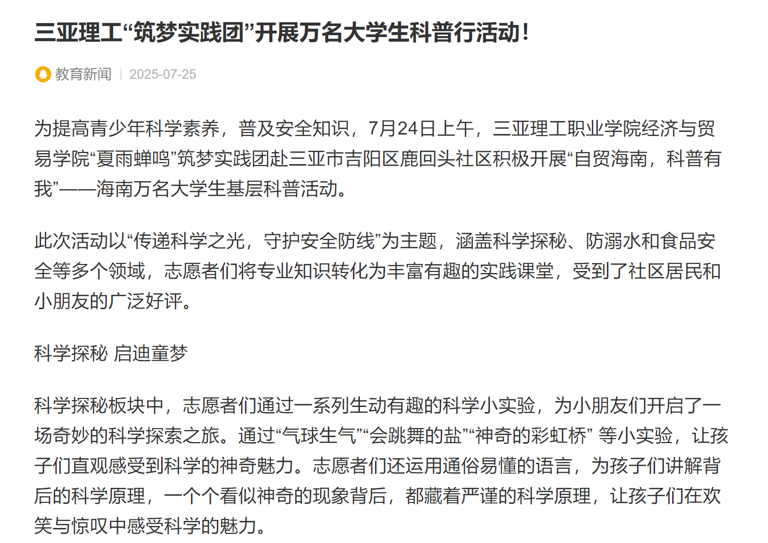 【騰訊新聞】三亞理工“筑夢實(shí)踐團(tuán)”開展萬名大學(xué)生科普行活動!