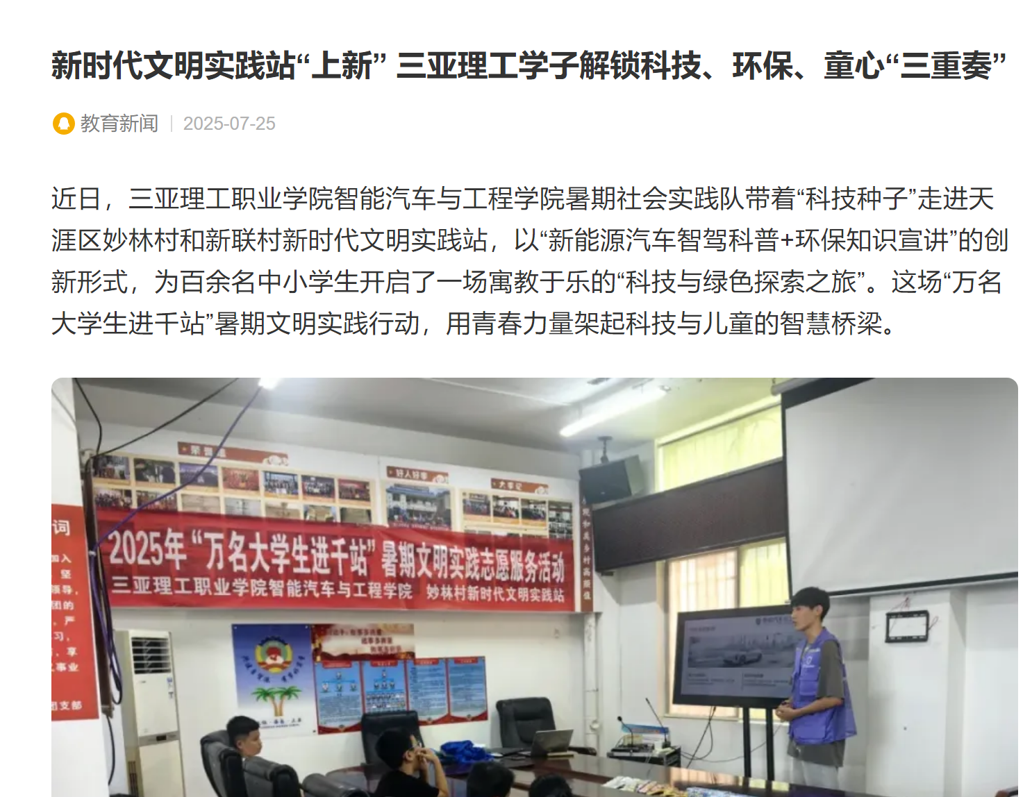 近日,三亞理工職業(yè)學(xué)院智能汽車與工程學(xué)院暑期社會實(shí)踐隊(duì)帶著“科技種子”走進(jìn)天涯區(qū)妙林村和新聯(lián)村新時代文明實(shí)踐站,以“新能源汽車智駕科普+環(huán)保知識宣講”的創(chuàng)新形式,為百余名中小學(xué)生開啟了一場寓教于樂的“科技與綠色探索之旅”。這場“萬名大學(xué)生進(jìn)千站”...