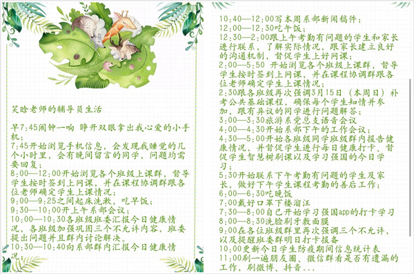 2020/4/21在線學(xué)習(xí),考驗(yàn)著大家對(duì)時(shí)間的管理能力,能否擁有一份完美的居家作息時(shí)間表,就取決于你的良好生活習(xí)慣和積極自律。為提高師生居家學(xué)習(xí)效率,我院師生制定了學(xué)習(xí)、飲食、運(yùn)動(dòng)等作息表,一起來看一看這份“居家小秘籍”。學(xué)生作息表分享建筑工程系王澳航空服務(wù)系任圓...