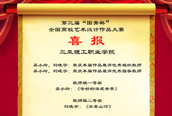 2019/12/17近日,由中國(guó)人生科學(xué)學(xué)會(huì)舉辦的第三屆“國(guó)青杯”全國(guó)高校藝術(shù)與設(shè)計(jì)作品征集比賽落下帷幕。此次比賽三亞理工職業(yè)學(xué)院共獲獎(jiǎng)項(xiàng)25項(xiàng),成績(jī)創(chuàng)歷史新高!皣(guó)青杯”全國(guó)高校藝術(shù)與設(shè)計(jì)作品展評(píng)活動(dòng)旨在鼓勵(lì)原創(chuàng),激發(fā)個(gè)性化、創(chuàng)新思維,展示藝術(shù)與設(shè)計(jì)最新成果,傳播...
