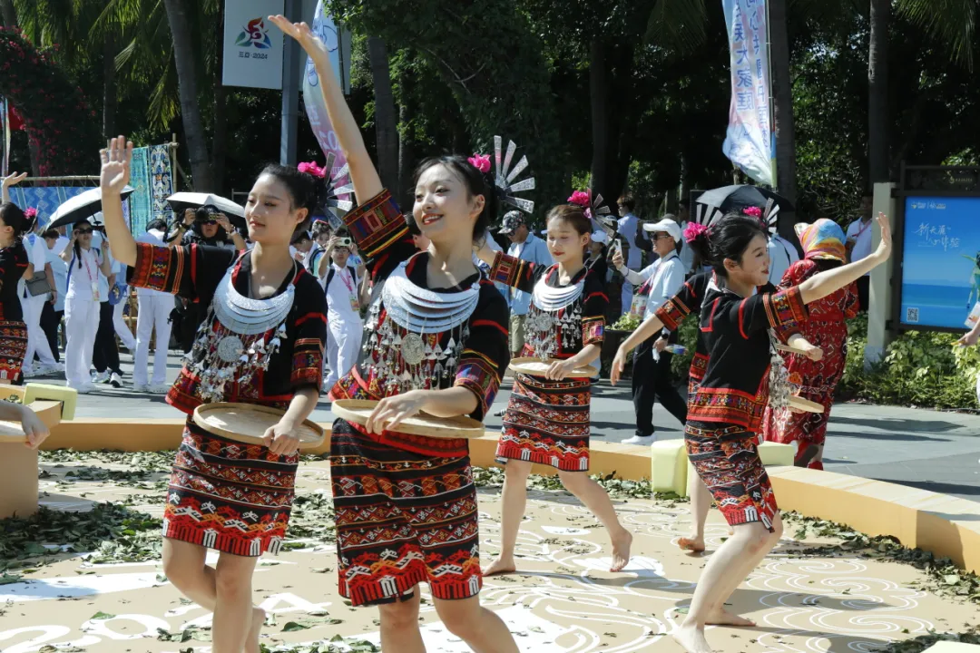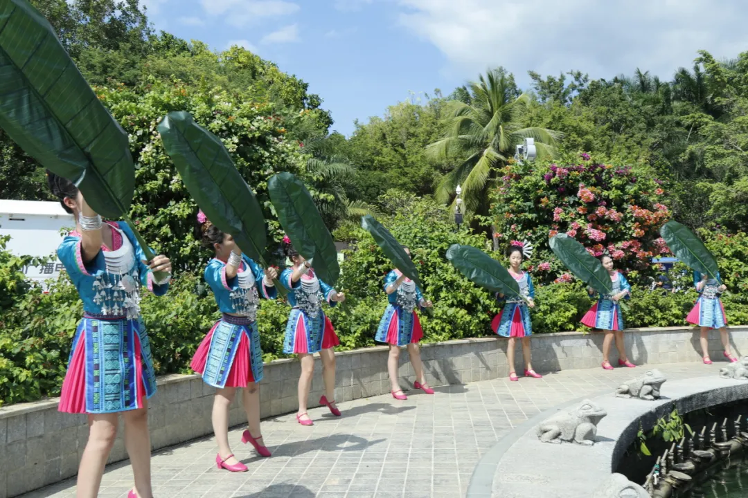 花壇中間,美麗的黎族少女手拿芭蕉葉,在舞臺上展示海南傳統(tǒng)舞蹈,美妙的歌聲、優(yōu)美的舞姿,在碧海藍天的掩映下,各民族的運動員歡聚在此,融匯在此!