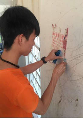 保護學(xué)院環(huán)境,人人有責(zé)。通過全校師生的共同努力使社區(qū)周邊環(huán)境逐漸得到改善,同學(xué)們的素質(zhì)也提高了不少。然而有些人為了自己的利益,到處亂貼小廣告,使這個美麗的校園一時間變成了臟兮兮的花臉貓,叫人慘不忍睹。于是,社區(qū)環(huán)保社工組織了一次刮小廣告的集體活動,為保護校園環(huán)境出一份力。