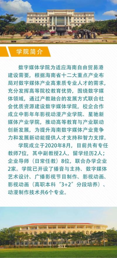 三亞理工職業(yè)學(xué)院數(shù)字媒體學(xué)院為適應(yīng)海南自由貿(mào)易港建設(shè)需要,根據(jù)海南省十二大重點(diǎn)產(chǎn)業(yè)布局對(duì)數(shù)字媒體產(chǎn)業(yè)高素質(zhì)專業(yè)人才的需求,充分發(fā)揮高等院校教育優(yōu)勢(shì),圍繞數(shù)字媒體領(lǐng)域,通過(guò)產(chǎn)教融合發(fā)展方式聯(lián)合社會(huì)優(yōu)質(zhì)資源建設(shè)數(shù)字媒體學(xué)院,校企合作成立中影年年影視動(dòng)漫產(chǎn)業(yè)學(xué)院、星馳新媒體產(chǎn)業(yè)學(xué)院,推動(dòng)高等教育與產(chǎn)業(yè)聯(lián)動(dòng)創(chuàng)新發(fā)展,為提升海南數(shù)字媒體產(chǎn)業(yè)競(jìng)爭(zhēng)力和發(fā)展新動(dòng)能提供人才支持和智力支撐。
