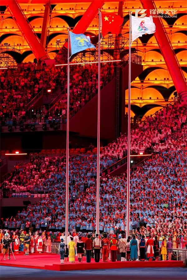 入場(chǎng)儀式完畢,全場(chǎng)起立,高唱中華人民共和國(guó)國(guó)歌,五星紅旗冉冉升起、迎風(fēng)飄揚(yáng)。