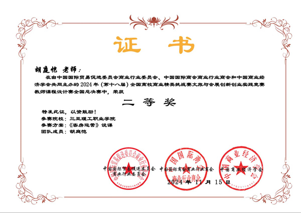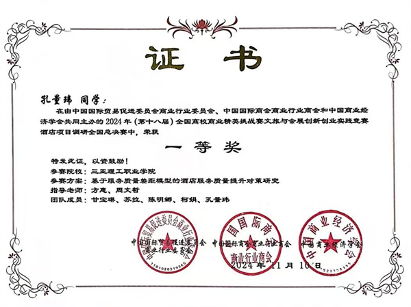在學生組全國總決賽中,學校代表隊捷報頻傳,榮獲一等獎、二等獎和三等獎各一項。在酒店項目調(diào)研賽道,通過深入調(diào)研和分析,參賽學生充分展示了他們對酒店行業(yè)的深刻理解和創(chuàng)新思維,贏得了評委的高度贊譽。