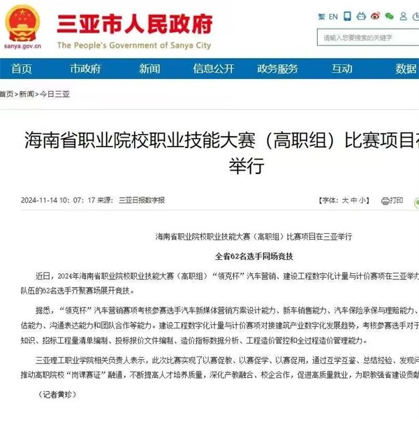 2024年11月,2024年海南省職業(yè)院校職業(yè)技能大賽(高職組)“領(lǐng)克杯”汽車營銷、建設(shè)工程數(shù)字化計量與計價兩個賽項在三亞理工職業(yè)學(xué)院舉行。