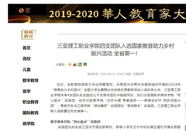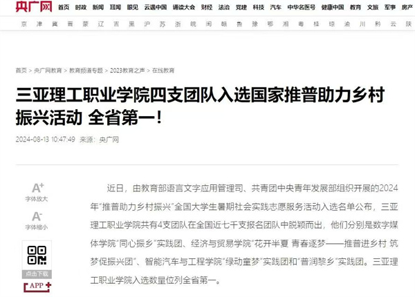 2024年暑期,由教育部語言文字應(yīng)用管理司、共青團中央青年發(fā)展部組織開展的2024年“推普助力鄉(xiāng)村振興”全國大學(xué)生暑期社會實踐志愿服務(wù)活動入選名單公布,三亞理工職業(yè)學(xué)院共有4支團隊在全國近七千支報名團隊中脫穎而出,他們分別是數(shù)字媒體學(xué)院“同心振鄉(xiāng)”實踐團、經(jīng)濟與貿(mào)易學(xué)院“花開半夏 青春逐夢——推普進鄉(xiāng)村 筑夢促振興團”、智能汽車與工程學(xué)院“綠動童夢”實踐團和“普潤黎鄉(xiāng)”實踐團。三亞理工職業(yè)學(xué)院入選數(shù)量位列全省第一。