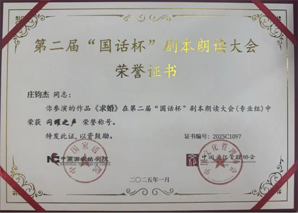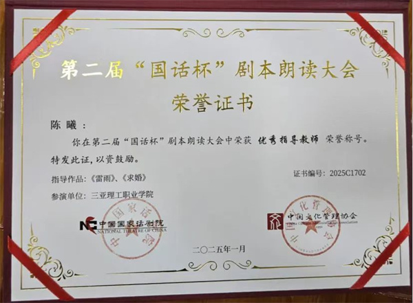 近日,從第二屆 “國話杯” 劇本朗讀大會組委會傳來喜訊,三亞理工職業(yè)學院數(shù)字媒體學院的師生們憑借出色表現(xiàn),在大賽中斬獲佳績。表演 231 班陶恒智、李泓辰,播音 241 班莊鈞杰出演的作品《求婚》;播音 241 班孫甜甜、連晨崳出演的作品《雷雨》,雙雙榮獲 “閃耀之聲” 獎,指導教師陳曦榮獲 “優(yōu)秀指導教師” 稱號。三亞理工職業(yè)學院憑借出色的組織工作榮獲 “優(yōu)秀組織單位獎”。
