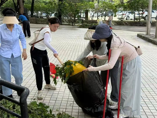 在魯班廣場旁,臺風(fēng)刮落的樹干枯枝堆積成兩米高的 "小山",黨員干部們徒手搬運、接力傳遞,將直徑近 20 厘米的樹干逐一裝載上垃圾轉(zhuǎn)運車,手掌磨出紅印卻無人喊停;主干道上,落葉與淤泥混合成 "攔路虎",黨員們手持鐵鍬、掃帚分組作業(yè),有人負責(zé)鏟除結(jié)塊淤泥,有人用力將枯枝落葉分裝入袋,汗水順著臉頰滴入積水,卻讓暢通的道路逐漸顯露本色;汗水濕透了衣衫,卻沒有一人停下手中的工作,大家相互協(xié)作,配合默契,黨員教師們蹲下身,耐心清理垃圾,用實際行動守護校園的每一抹綠色。