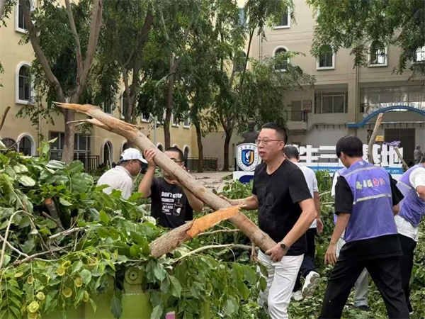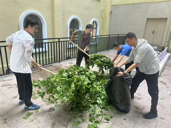 清晨 8:30,學(xué)校魯班廣場上黨旗獵獵,黨員干部們身著防曬服、手持勞動工具整齊列隊。校領(lǐng)導(dǎo)率先扛起粗大樹枝,并帶領(lǐng)隊伍分赴書善樓周邊、R1-R7 宿舍區(qū)開展清理。現(xiàn)場呈現(xiàn)出一幕幕動人場景: