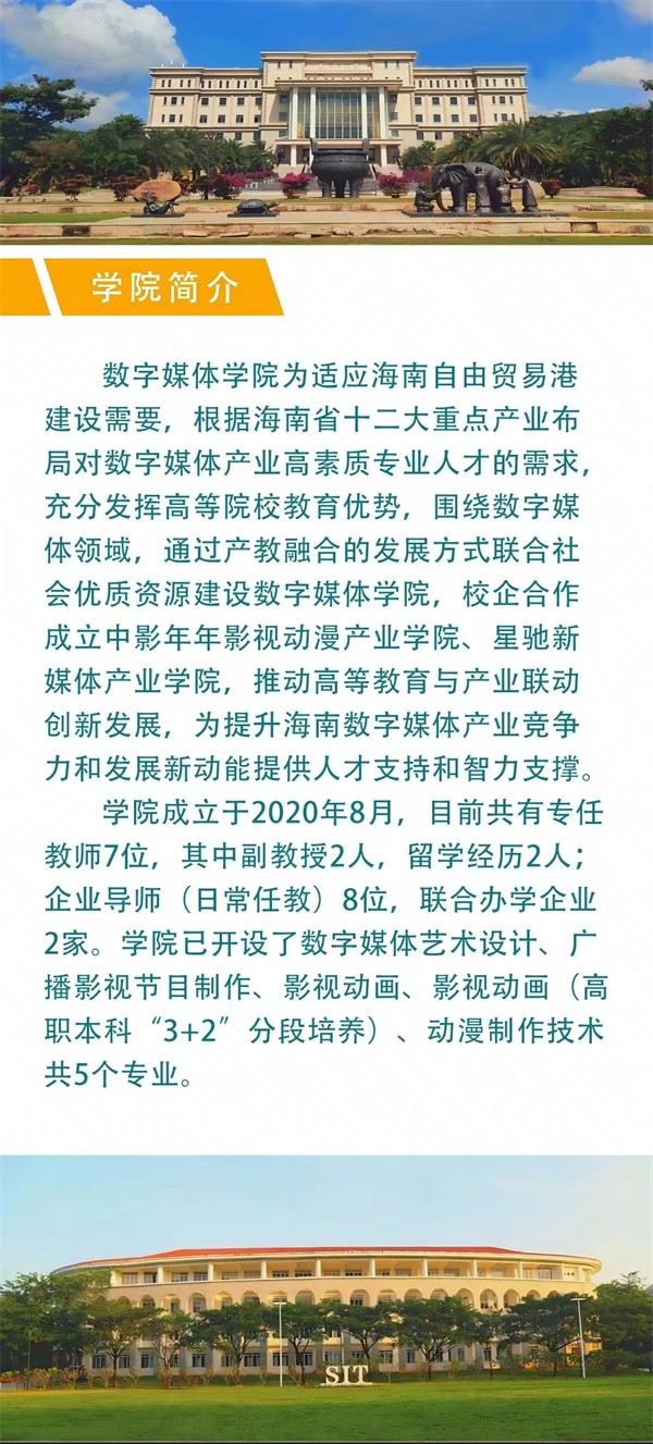 為適應海南自由貿(mào)易港建設需要,根據(jù)海南省十二大重點產(chǎn)業(yè)布局對數(shù)字媒體產(chǎn)業(yè)高素質專業(yè)人才的需求,三亞理工職業(yè)學院圍繞數(shù)字媒體領域,通過產(chǎn)教融合的發(fā)展方式聯(lián)合社會優(yōu)質資源建設數(shù)字媒體學院。校企合作成立中影年年影視動漫產(chǎn)業(yè)學院、星馳新媒體產(chǎn)業(yè)學院,推動高等教育與產(chǎn)業(yè)聯(lián)動創(chuàng)新發(fā)展,為提升海南數(shù)字媒體產(chǎn)業(yè)競爭力和發(fā)展新動能提供人才支持和智力支撐。