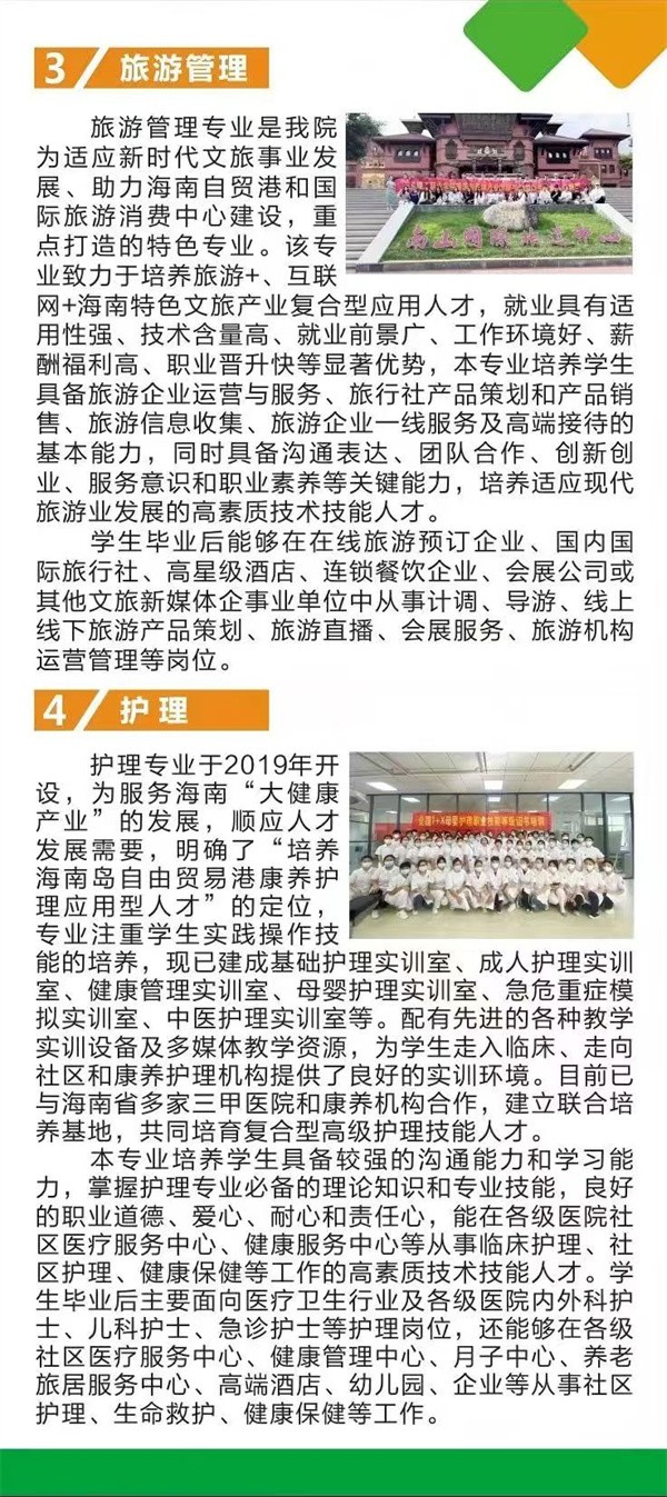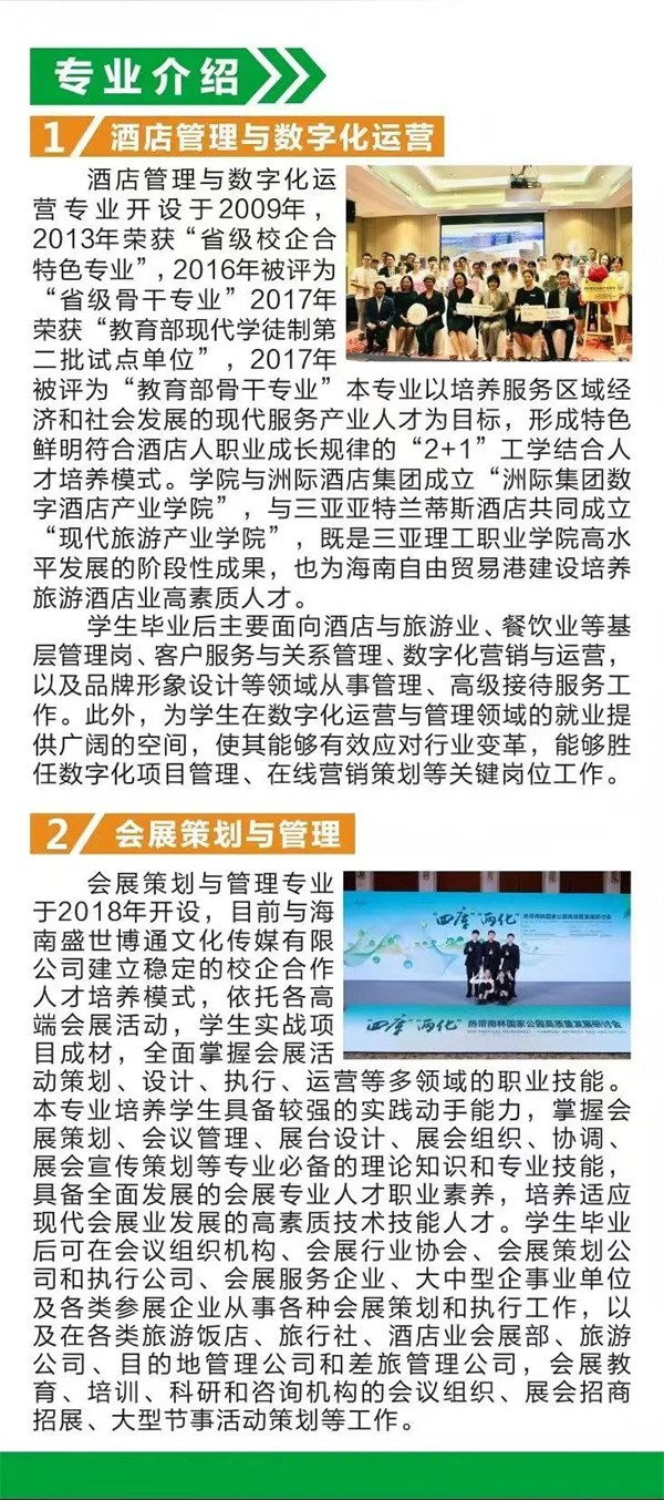 旅游與康體產(chǎn)業(yè)學(xué)院現(xiàn)有酒店管理與數(shù)字化運(yùn)營(yíng)、酒店管理與數(shù)字化運(yùn)營(yíng)(3+2)、旅游管理、會(huì)展策劃與管理、會(huì)展策劃與管理(3+2)、護(hù)理、護(hù)理(3+2)等7個(gè)專(zhuān)業(yè)。其中酒店管理與數(shù)字化運(yùn)營(yíng)、會(huì)展策劃與管理、護(hù)理專(zhuān)業(yè)均與三亞學(xué)院合作開(kāi)展高職與普通本科“3+2”分段培養(yǎng)項(xiàng)目。