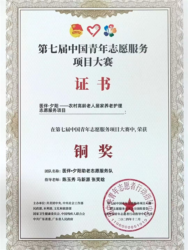 在第七屆中國(guó)青年志愿服務(wù)項(xiàng)目大賽中,由三亞理工職業(yè)學(xué)院旅游與康體產(chǎn)業(yè)學(xué)院陳玉秀、馬新源和張笑晗三位老師共同指導(dǎo),周子怡、黃路明等10名學(xué)生參與的《醫(yī)伴·夕陽(yáng) ——農(nóng)村高齡老人居家養(yǎng)老護(hù)理志愿服務(wù)項(xiàng)目》榮獲大賽銅獎(jiǎng)。這是學(xué)校首次斬獲此項(xiàng)賽事國(guó)家級(jí)、。▍^(qū)、市)級(jí)“雙榮譽(yù)”。