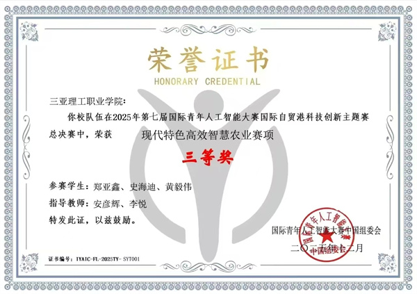 第七屆國(guó)際青年人工智能大賽國(guó)際自貿(mào)港科技創(chuàng)新主題賽總決賽中,三亞理工職業(yè)學(xué)院智能汽車與工程學(xué)院學(xué)生榮獲國(guó)賽二等獎(jiǎng)1項(xiàng),三等獎(jiǎng)2項(xiàng)。