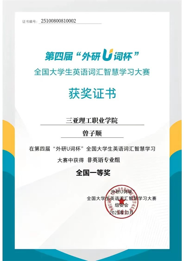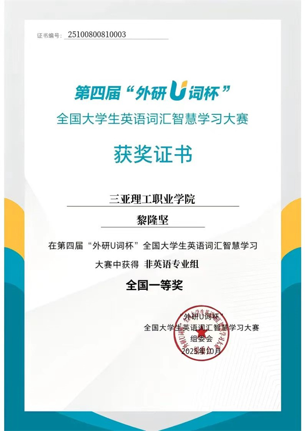 三亞理工職業(yè)學(xué)院學(xué)子,在第四屆“外研U詞杯”全國(guó)大學(xué)生英語(yǔ)詞匯智慧學(xué)習(xí)大賽中,榮獲“非英語(yǔ)專業(yè)組”全國(guó)一等獎(jiǎng)3項(xiàng)、三等獎(jiǎng)1項(xiàng)。