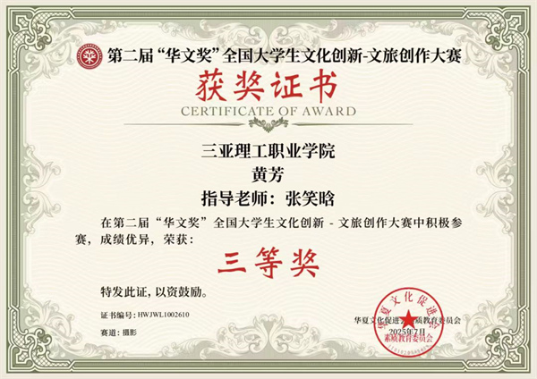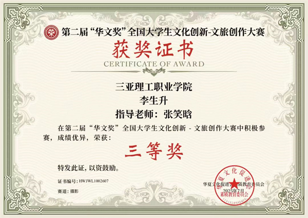 三亞理工職業(yè)學(xué)院數(shù)字媒體學(xué)院學(xué)生榮獲第二屆大學(xué)生當(dāng)代攝影獎(jiǎng)自由創(chuàng)作賽道紀(jì)實(shí)類作品銅獎(jiǎng)。