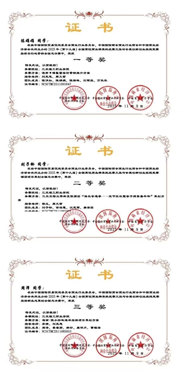 在第十九屆全國(guó)高校商業(yè)精英挑戰(zhàn)賽中,三亞理工職業(yè)學(xué)院旅游與康體產(chǎn)業(yè)學(xué)院師生團(tuán)隊(duì)?wèi){借卓越的創(chuàng)新能力和扎實(shí)的實(shí)戰(zhàn)功底,斬獲一等獎(jiǎng)3項(xiàng)、二等獎(jiǎng)1項(xiàng)、三等獎(jiǎng)1項(xiàng)。