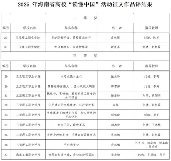 海南省教育廳關(guān)心下一代工作委員會(huì)(簡(jiǎn)稱“關(guān)工委”)公布全省高校“讀懂中國(guó)”活動(dòng)評(píng)審結(jié)果,三亞理工職業(yè)學(xué)院選送的作品,分別榮獲一等獎(jiǎng)1項(xiàng),二等獎(jiǎng)4項(xiàng)、三等獎(jiǎng)16項(xiàng)和優(yōu)秀組織單位。