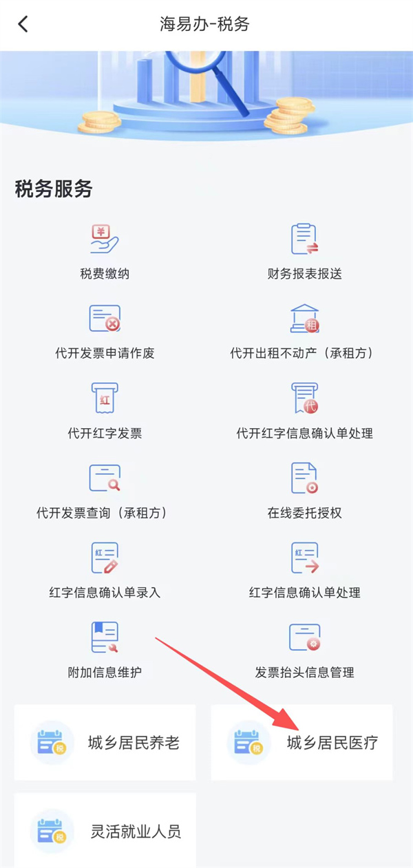 進(jìn)入海易辦首頁,點(diǎn)擊“稅務(wù)”——“城鄉(xiāng)居民醫(yī)療”進(jìn)入繳費(fèi)頁面。