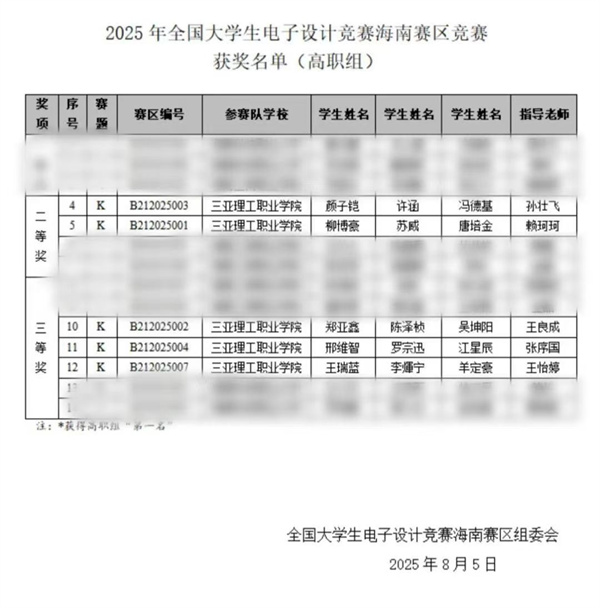 近日,三亞理工職業(yè)學(xué)院智能汽車與工程學(xué)院組織學(xué)生參加2025年全國大學(xué)生電子設(shè)計競賽海南賽區(qū)比賽首創(chuàng)佳績!共榮獲省級二等獎2項、三等獎3項。
