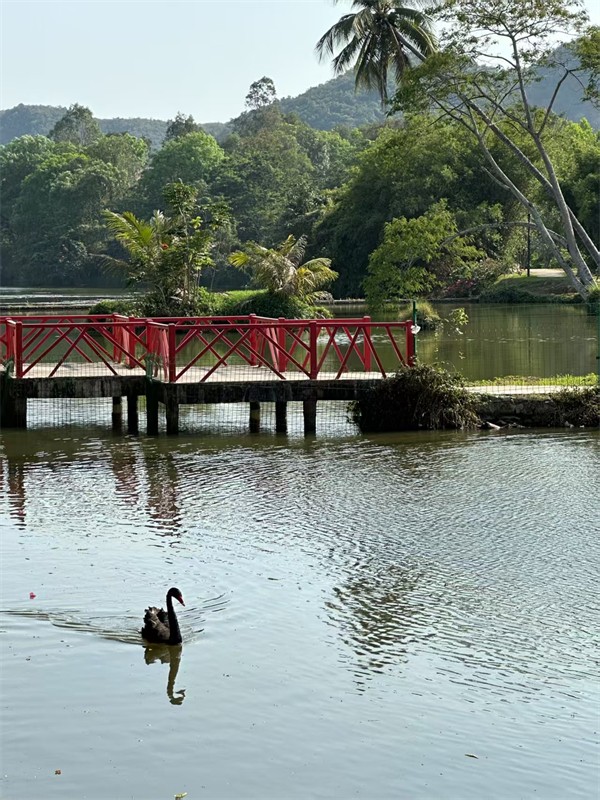 校園的湖畔,時光悠然。湖水如鏡,黑天鵝優(yōu)雅游弋,泛起層層漣漪。紅橋橫跨湖面,與綠樹繁花相映成趣,似一幅靈動的水彩畫。