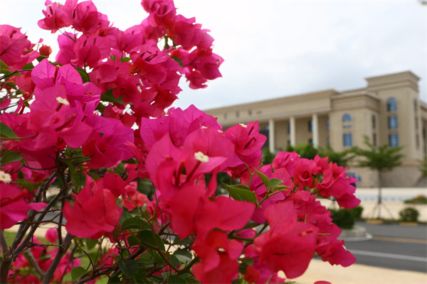 漫步在校園,邂逅一路繁花。嬌艷的雞蛋花在枝頭綻放,似在訴說著夏日的溫柔;熱烈的三角梅肆意生長,用一抹抹絢爛點(diǎn)燃時(shí)光。宮商樓靜靜佇立,承載著知識(shí)的重量。繁茂的樹木枝葉交織,灑下細(xì)碎光影。這里的一切,都在書寫著獨(dú)屬于校園的青春詩章。