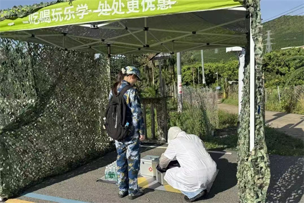 拉練隊(duì)伍中,有一群特殊的身影——人武部參謀、學(xué)工處老師、各學(xué)院輔導(dǎo)員、校醫(yī)院醫(yī)生、學(xué)生志愿者和后勤保障人員。他們?nèi)谈S,及時(shí)為同學(xué)們提供幫助。