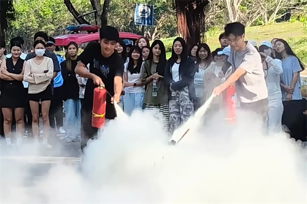 教官首先對干粉滅火器的操作要領進行了細致講解,并用朗朗上口的“提、拔、握、壓”四字口訣幫助大家快速記憶。隨后,他點燃了演練火盆,瞬間燃起的火焰讓現(xiàn)場氣氛緊張起來。只見教官動作干脆利落,迅速將火焰撲滅,贏得了同學們的陣陣掌聲。